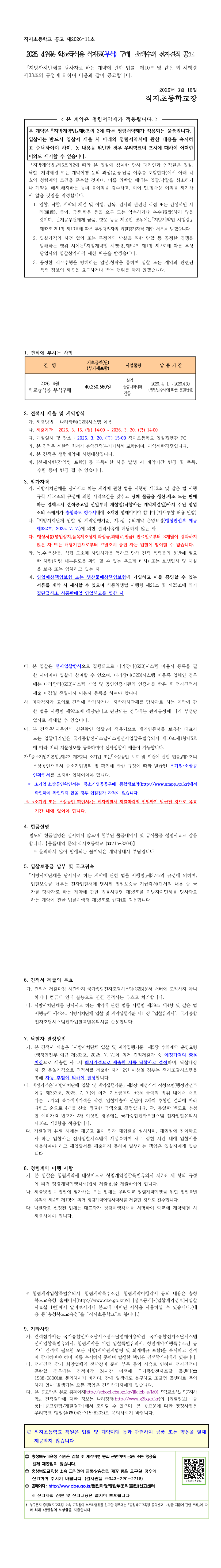 2026년 4월분 학교급식용 식재료(부식) 구매 소액수의 전자견적 공고 |