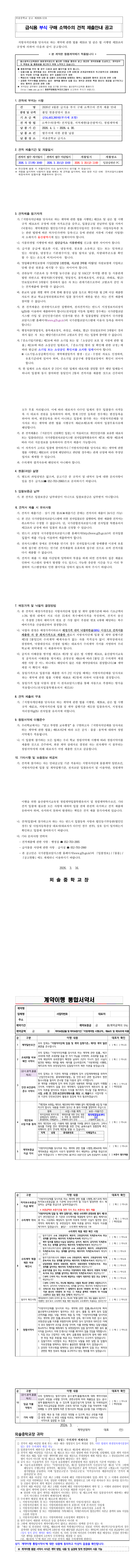 외솔중학교 2026년 4월분 급식용 부식 구매 소액수의 견적 제출 안내 공고 |