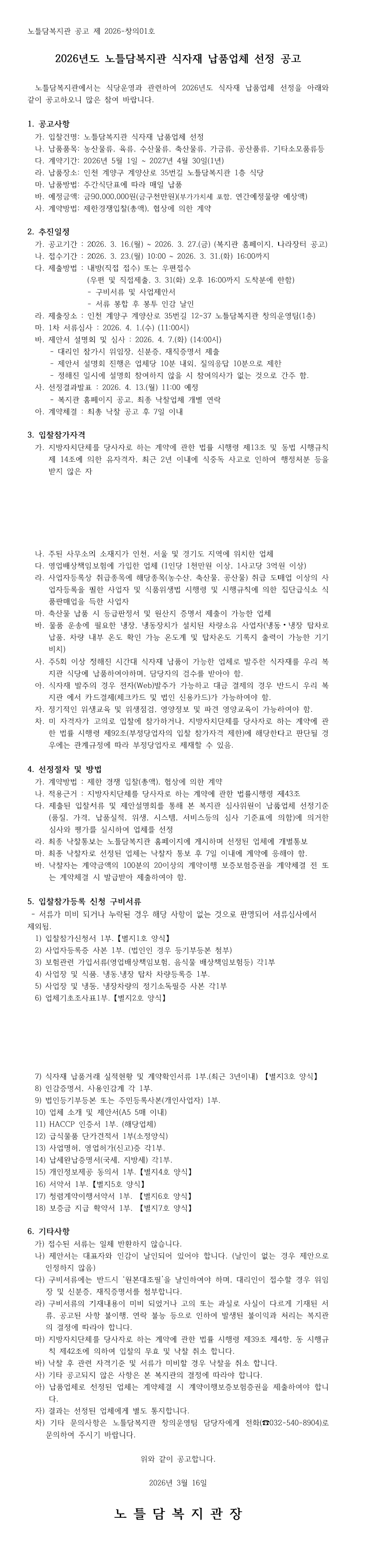 2026년 노틀담복지관 식자재 납품업체 선정 공고 |