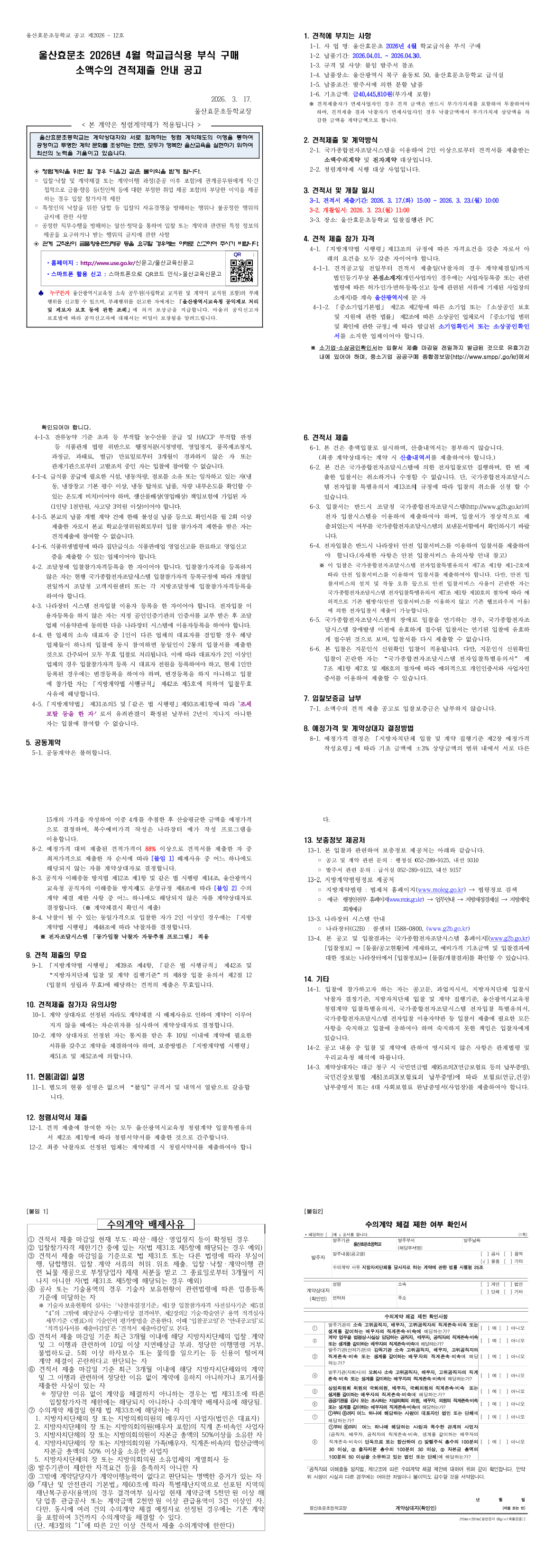 2026년 4월 학교급식용 부식 구매 소액수의 견적제출 안내 |