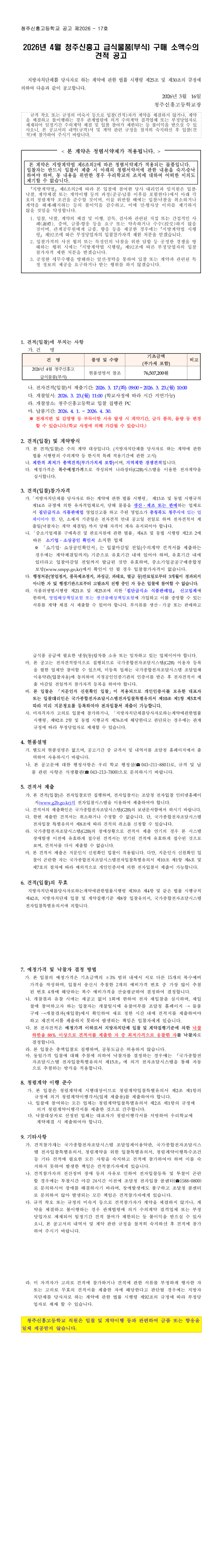 2026년 4월 청주신흥고 급식물품(부식) 구매 수의 견적 공고 |