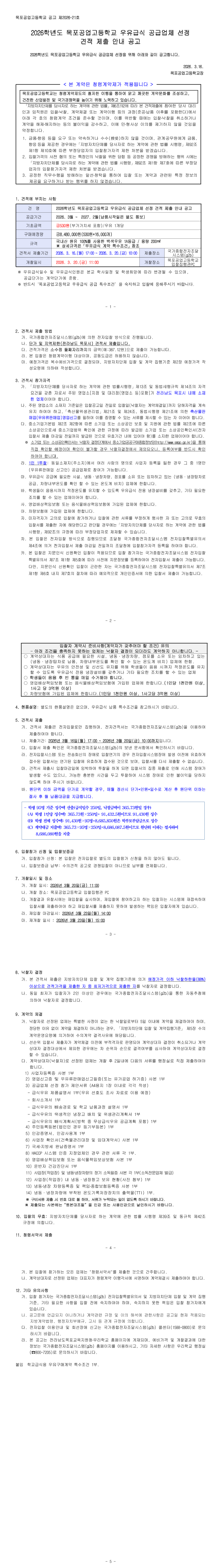 2026학년도 목포공업고등학교 우유급식 업체 선정 견적 제출 입찰 공고 |