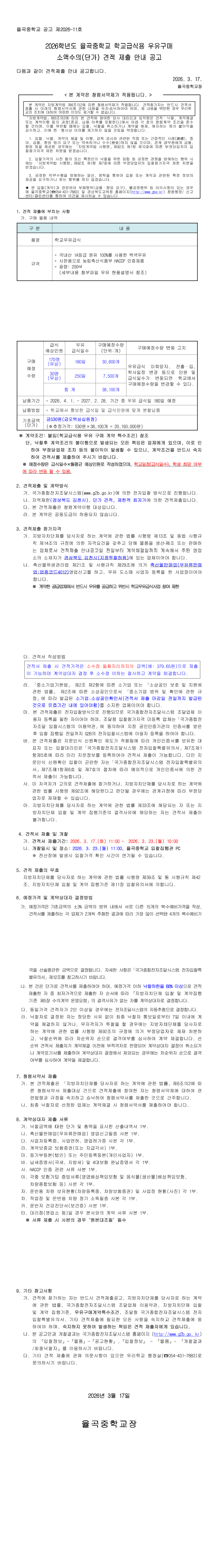 2026학년도 율곡중학교 학교급식용 우유구매 소액수의(단가) 견적 제출 공고 |