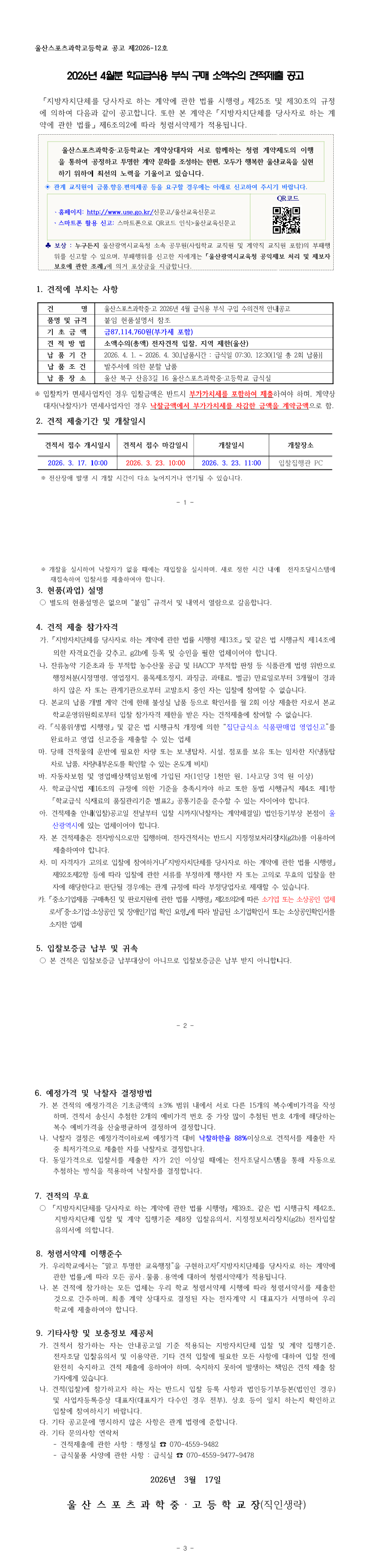 울산스포츠과학중고 2026년 4월 급식용 부식 구입 소액수의 견적 공고 |