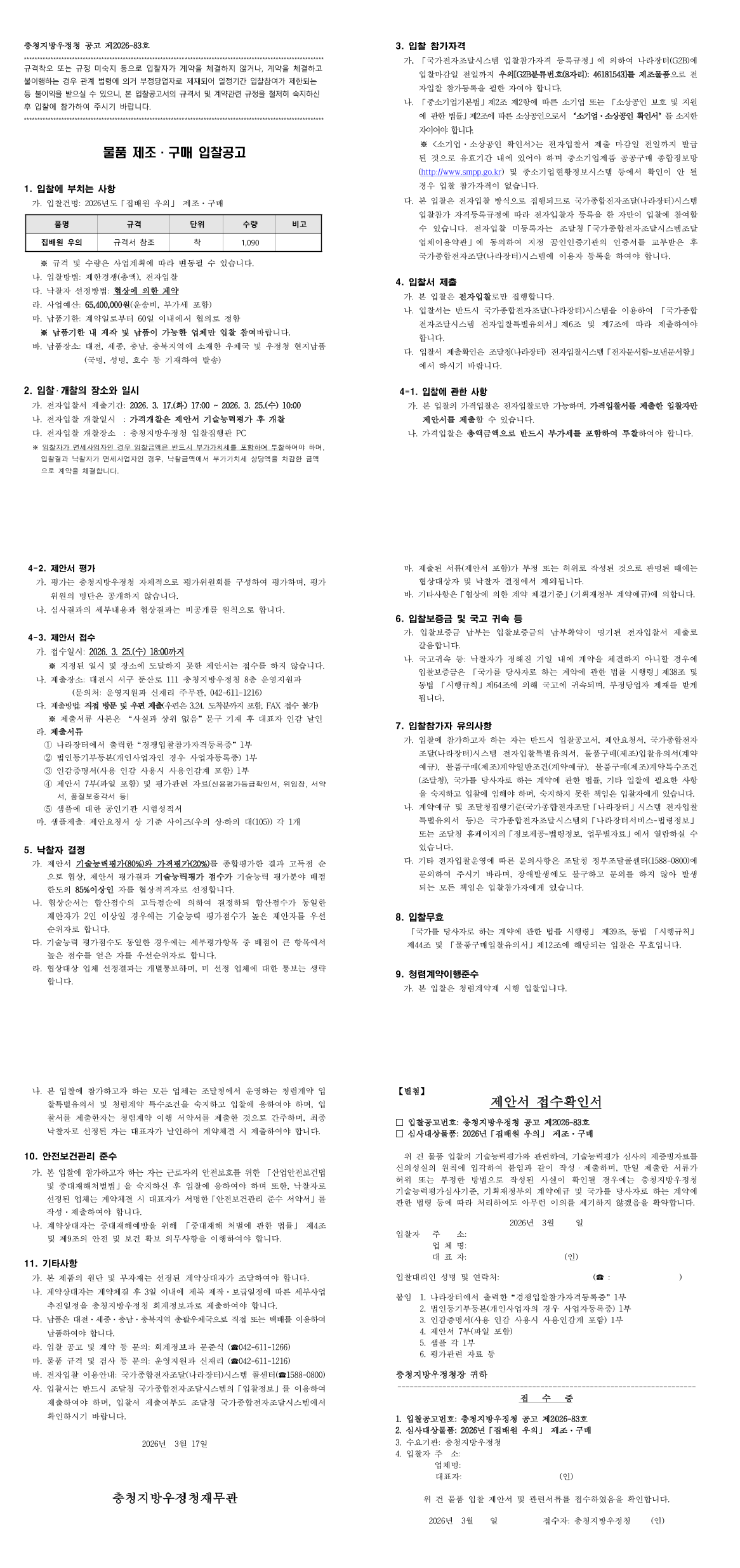 2026년도 충청지방우정청 집배원 우의 제조 구매 |