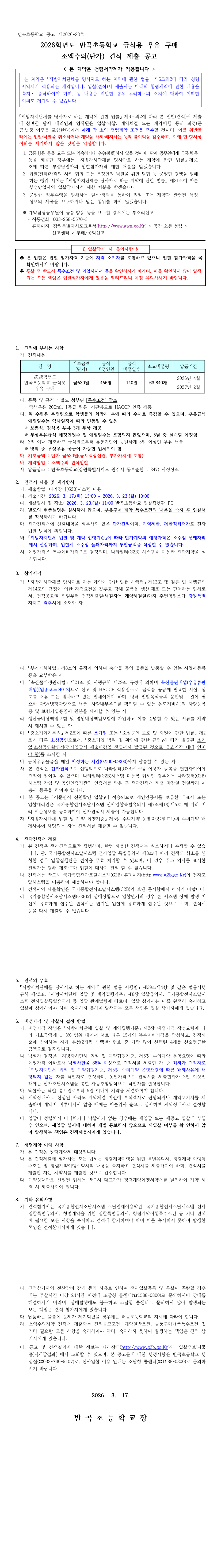 2026학년도 반곡초등학교 급식용 우유 구매 소액수의(단가) 견적 제출 공고 |