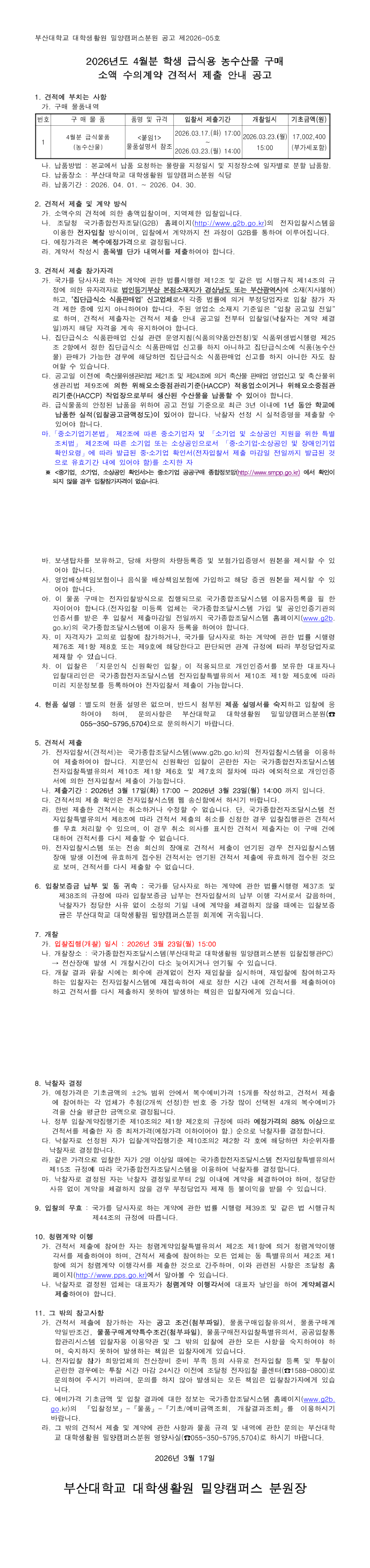 부산대학교 대학생활원 밀양분원 2026. 4월분 농수산물 구매 수의계약 견적 제출 공고 |