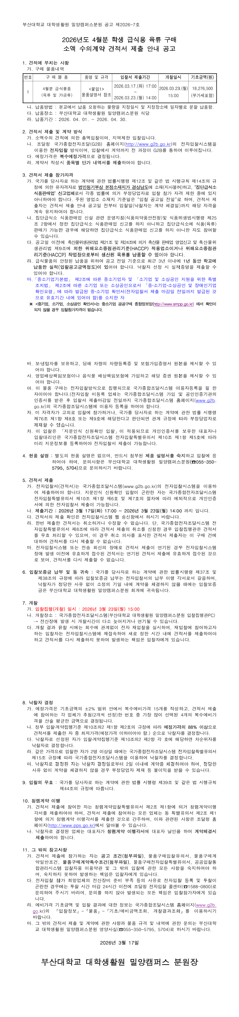 부산대학교 대학생활원 밀양분원 2026. 4월분 육류 구매 수의계약 견적 제출 공고 |