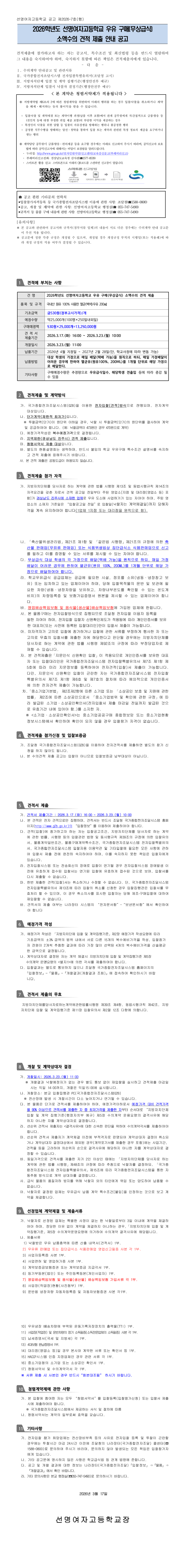 2026학년도 선명여자고등학교 우유 구매[무상급식] 소액수의 견적 제출 안내 공고 |