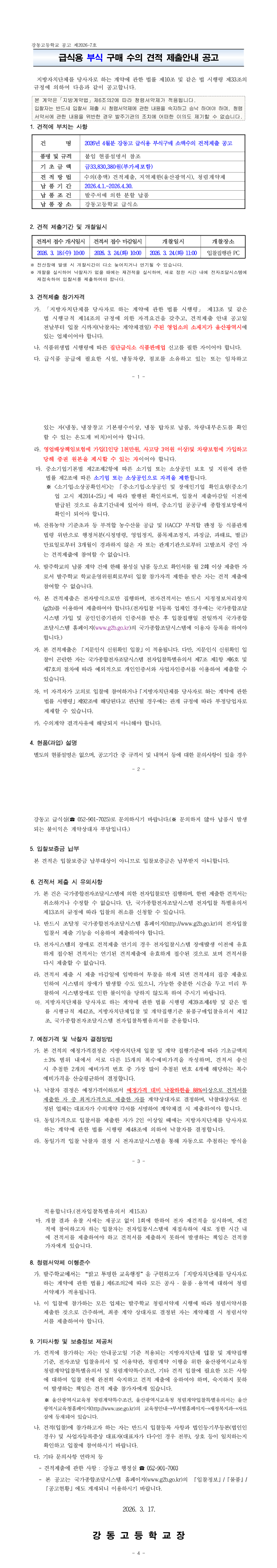 2026년 4월분 강동고등학교 학교급식용 부식구매 소액수의 공고 |