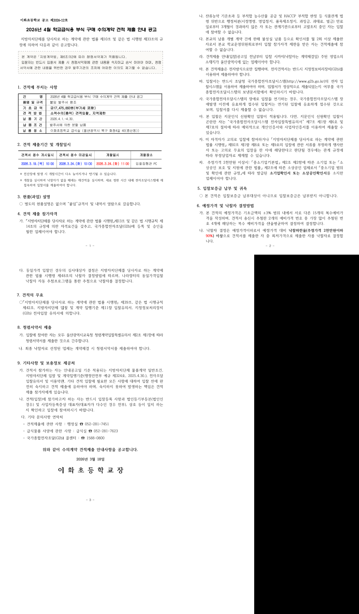 2026년 4월 이화초등학교 학교 급식용 부식 구매 수의견적 제출안내 공고 |