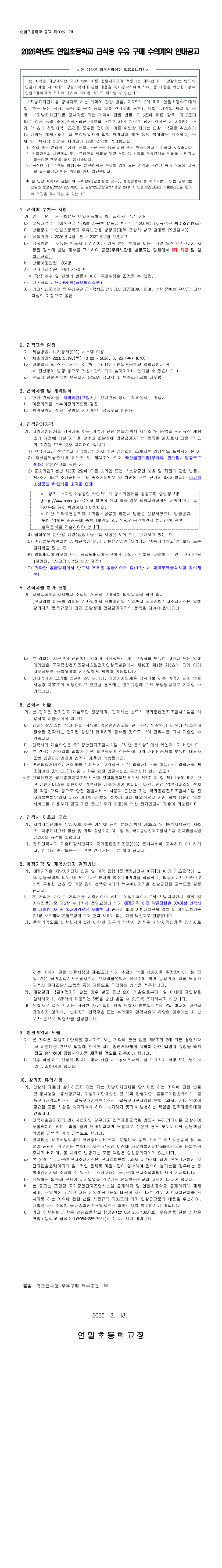 2026학년도 포항연일초등학교 급식용 우유 구매 수의계약 안내공고 |