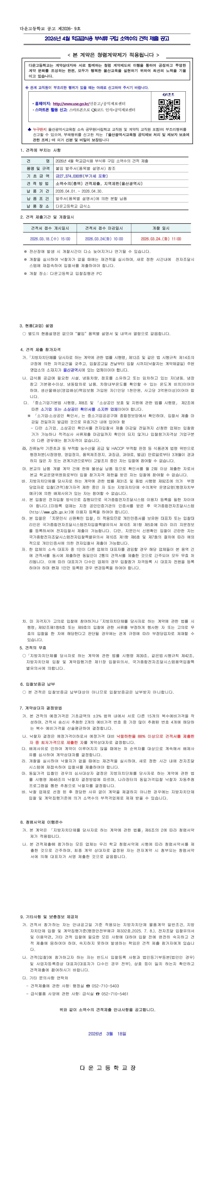 2026년 4월 급식용 부식류 구입 소액수의 전자견적 제출 |
