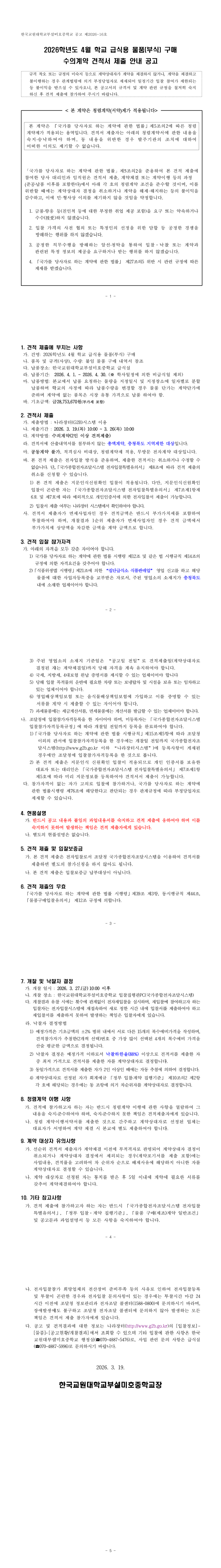 2026학년도 4월 한국교원대부설미호중학교 급식용 물품(부식) 구매 |