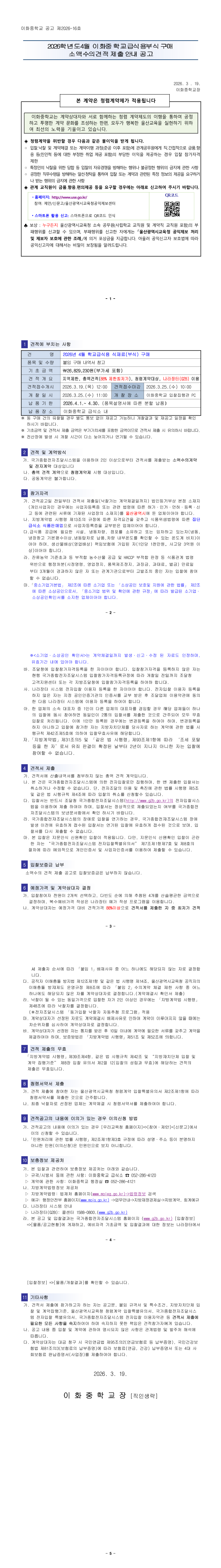 2026년 4월 이화중 학교급식용 식재료(부식) 구매 수의계약 견적공고 |