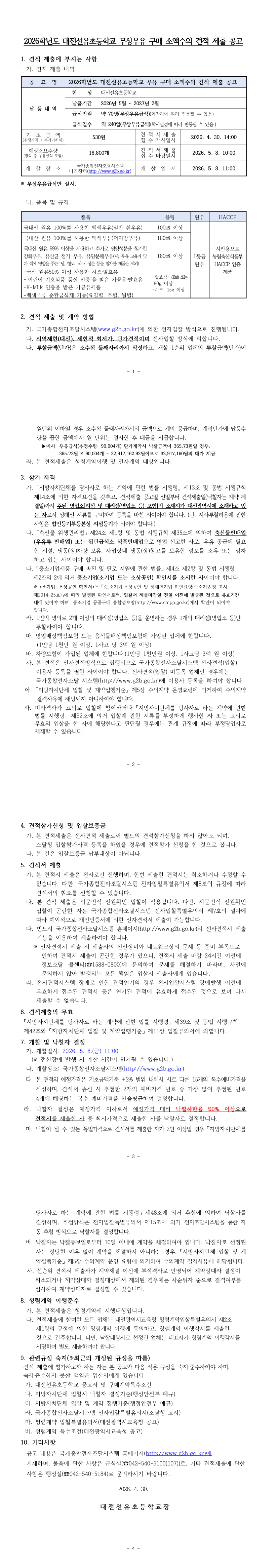 2026학년도 대전선유초등학교 무상우유 구매 견적제출 공고 |