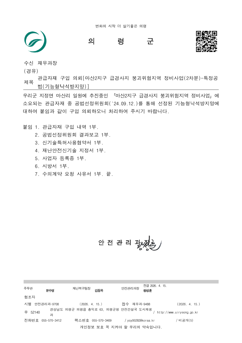 마산2지구 급경사지 붕괴위험지역 정비사업(2차분) 관급자재(기능형 낙석방지망) 구입 |