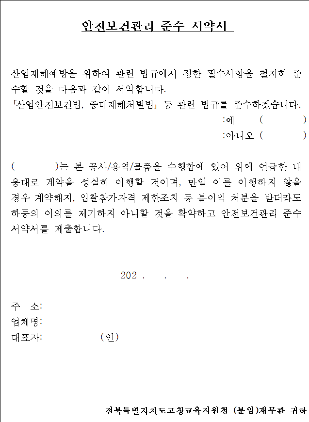 나. 본 견적(입찰)에 참가하고자 하는 자는 중대재해 예방을 위한 안전 및 보건 확보 의무사항을 숙지하신 후 견적(입찰)에 응하여야 하며, 계약 체결 시에 【붙임 1】「안전보건관리 준수 서약서」를 제출하여야 합니다.