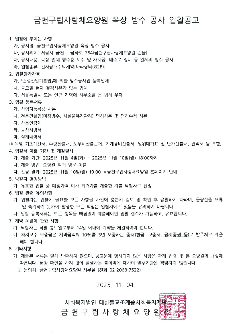 금천구립사랑채요양원 옥상 방수 공사 입찰 공고 |
