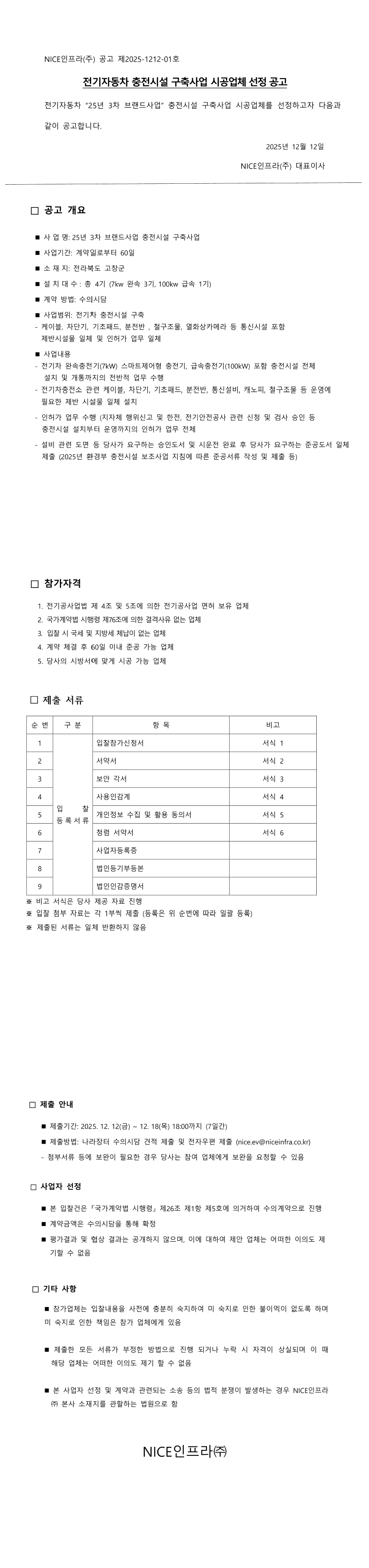 25년 3차 브랜드사업 충전시설 구축사업 시공업체 선정 공고 |