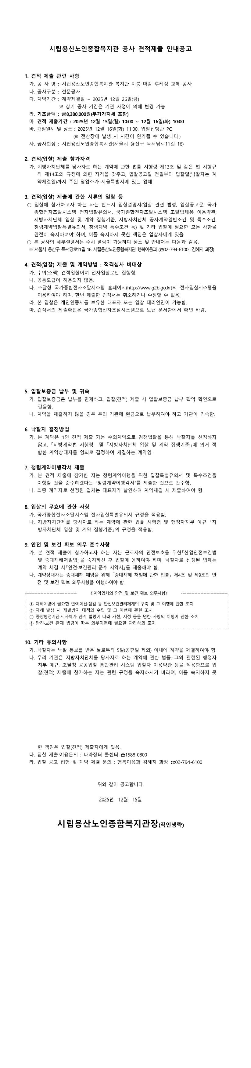 시립용산노인종합복지관 복지관 지붕 마감 후레싱 교체 공사 견적제출 공고 |