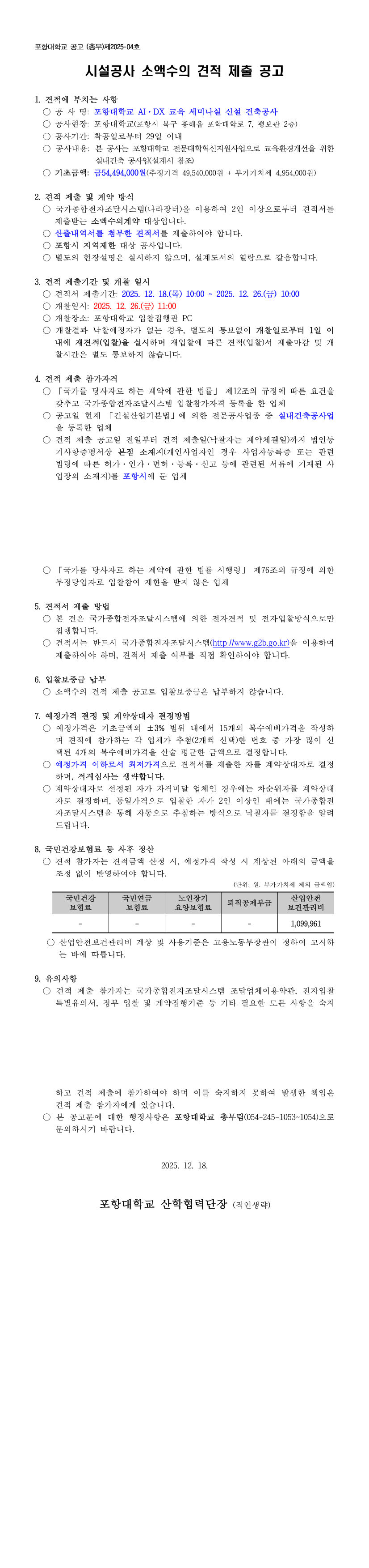 포항대학교 AIㆍDX 교육 세미나실 신설 건축공사 소액수의 견적 공고 |