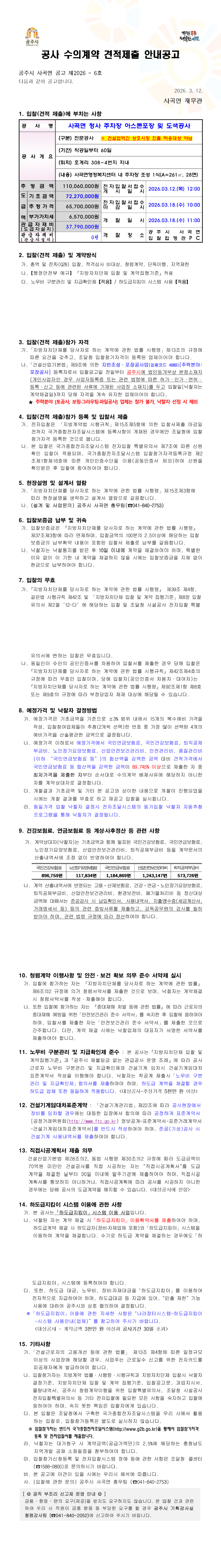 사곡면 청사 주차장 아스콘 포장 및 도색공사 수의계약 견적제출 안내 공고 |
