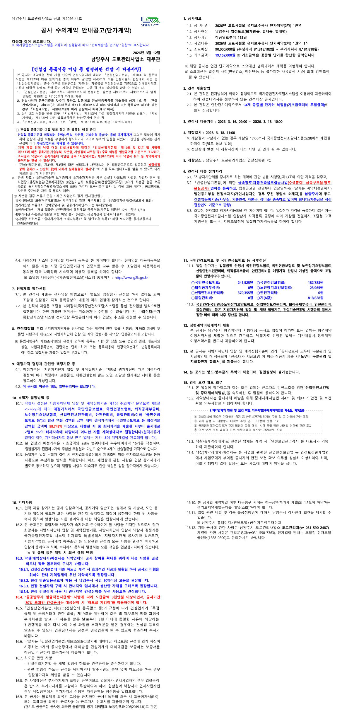 2026년 도로시설물 유지보수공사 단가계약(2차) 1권역 |