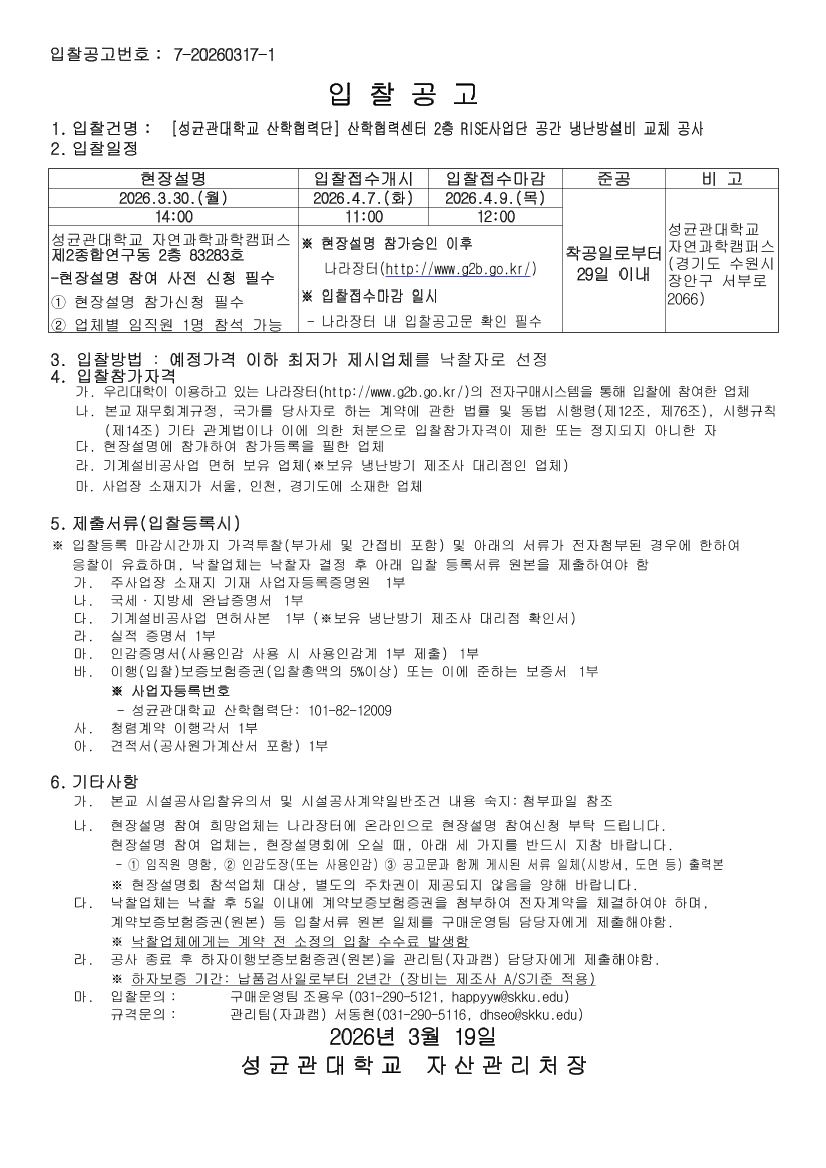 [성균관대학교 산학협력단] 산학협력센터 2층 RISE사업단 공간 냉난방설비 교체 공사 |