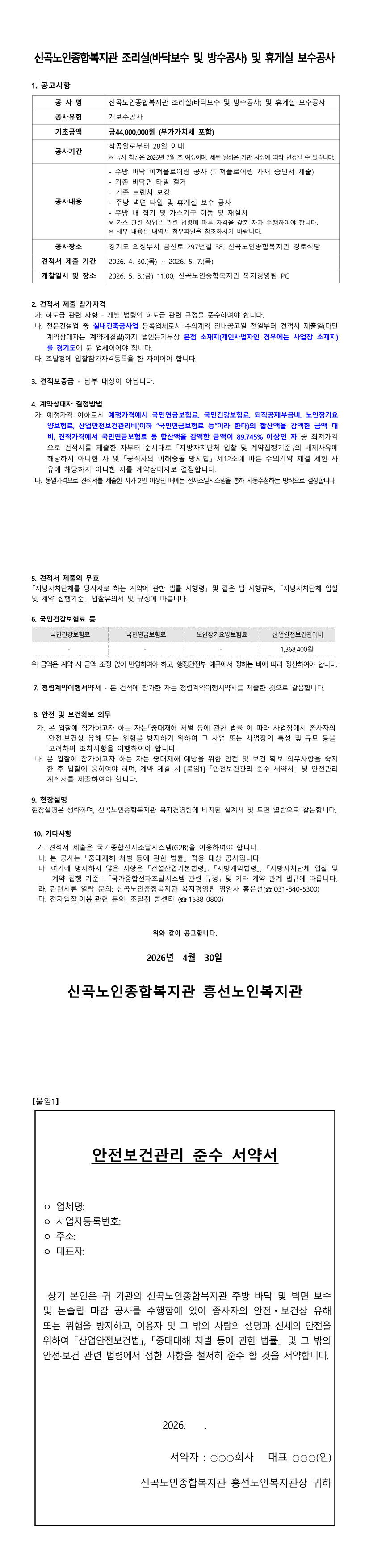 신곡노인종합복지관 조리실(바닥보수 및 방수공사) 및 휴게실 보수공사 |