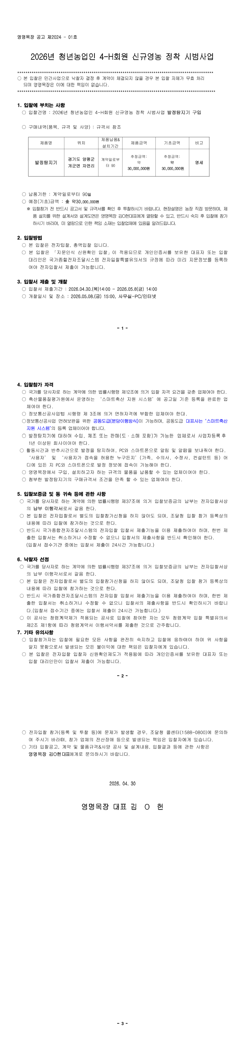 2026년 청년농업인 4-H회원 신규영농 정착 시범사업 발정탐지기 설치 공사 |