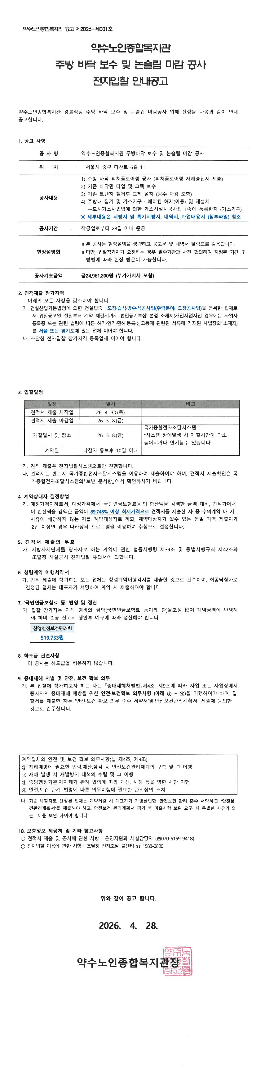 약수노인종합복지관 주방바닥 보수 및 논슬립 마감 공사 |