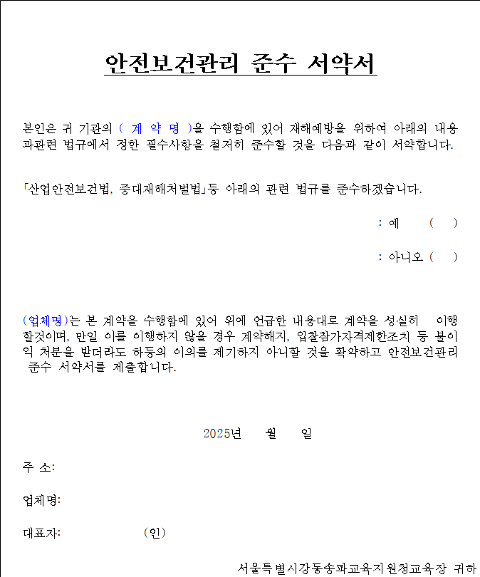 나. 본 입찰(견적서 제출)에 참여하고자 하는 자는 중대재해 예방을 위한 「안전보건관리 준수 서약서」를 숙지하신 후 입찰에 응하여야 하며, 입찰서를 제출한 자는 「안전보건관리 준수 서약서」를 제출한 것으로 간주합니다. 다만, 계약체결 후 착수계 제출 시 업체 대표자가 서명한 서약서, 안전보건관리계획서 등을 제출해야 합니다.