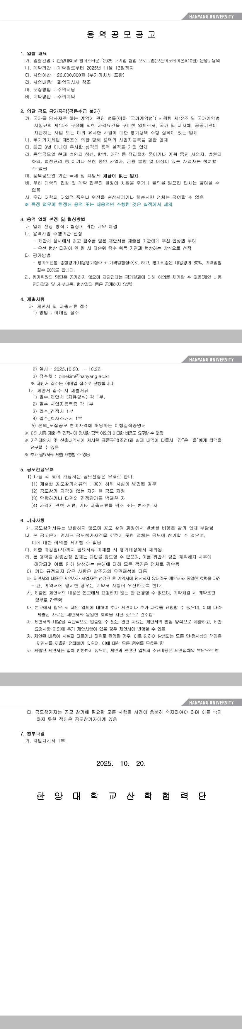 한양대학교 캠퍼스타운「2025 대기업 협업 프로그램(오픈이노베이션) 운영」용역 |