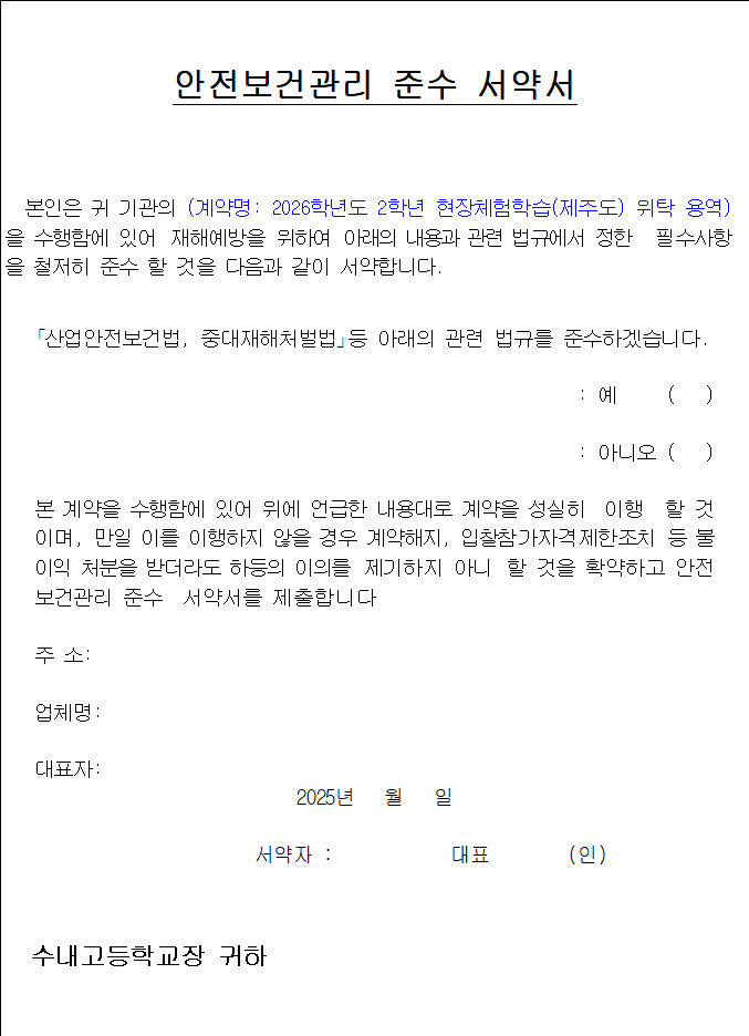 본인은 수내고등학교장의「2026학년도 2학년 현장체험학습(제주도) 위탁용역」업무를 수행함에 있어 다음 사항을 준수할 것을 엄숙히 서약합니다.