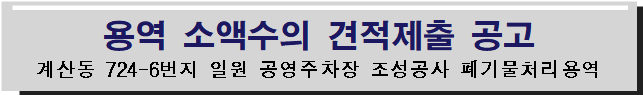 『계산동 724-6번지 일원 공영주차장 조성공사 폐기물처리용역』계약을 위하여 「지방자치단체를 당사자로 하는 계약에 관한 법률」제10조 및 같은 법 시행령 제30조, 지방자치단체 입찰 및 계약집행기준의 규정에 따라 붙임과 같이 수의견적 제출 안내 공고합니다.
