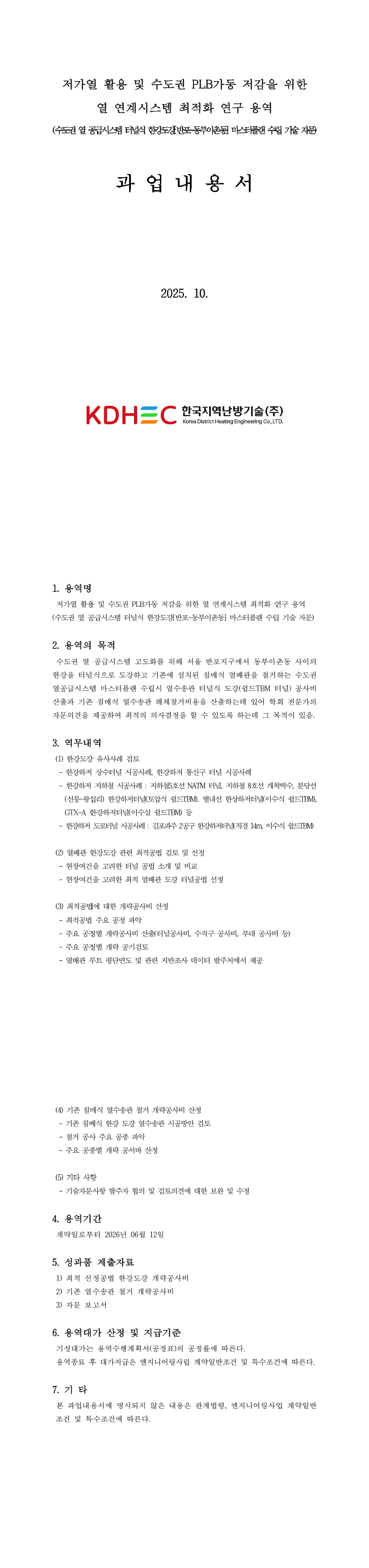 저가열 활용 및 수도권 PLB가동 저감 위한 열 연계시스템 최적화 연구 용역(수도권 열 공급시스템 터널32식 한강도강[반포∼동부이촌동] 마스터플랜 수립) |