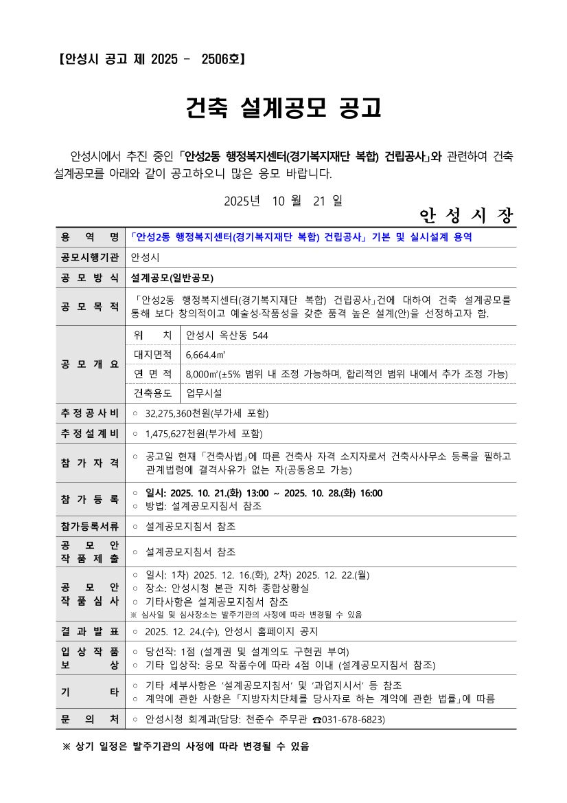 안성2동 행정복지센터(경기복지재단 복합) 건립 설계공모 |
