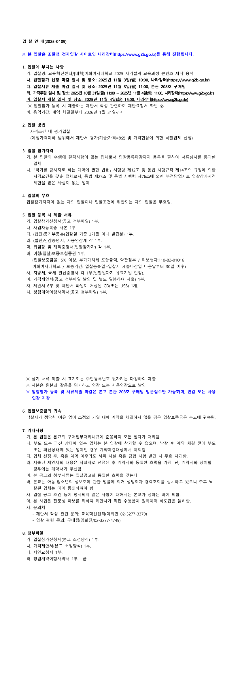 [용역/일반평가]교육혁신센터/[대혁]이화여자대학교 2025 자기설계 교육과정 콘텐츠 제작 용역 |
