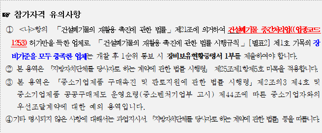⦁「지방자치단체 입찰 및 계약집행기준」제5장 제9절 및 [별표1]과 「공직자의 이해충돌 방지법」제12조에 해당하지 않는 업체여야 합니다.