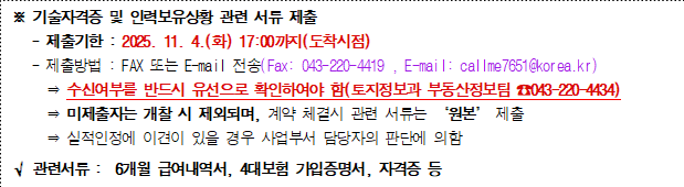 나. 개찰일시·장소 : 2025. 11. 4.(화) 11:00 / 충청북도 회계과 입찰집행관 PC