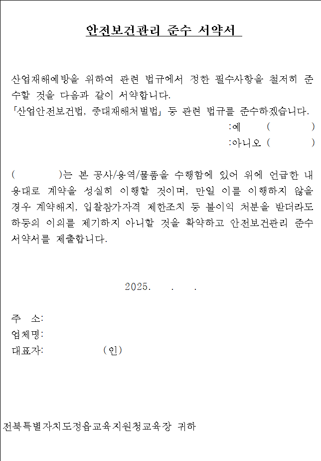 나. 본 입찰(견적제출)에 참가하고자 하는 자는 중대채해 예방을 위한 안전 및 보건 확보 의무사항을 숙지하신 후 입찰에 응하여야 하며, 계약 체결 시에 [붙임1]안전보건관리 준수 서약서를 제출하여야 합니다.