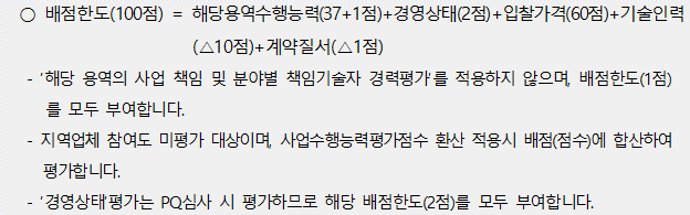 마. 당해용역 적격심사에 적용되는 세부기준은 다음과 같습니다. (상세내용은「지방자치단체 입찰 시 낙찰자 결정 기준」원문 참고)