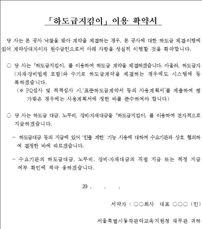 다. 낙찰을 받은 자는「하도급지킴이」를 이용하여 하도급 계약을 체결합니다. 다만, 하도급자(장비·자재업체 포함)와 수기로 하도급계약을 체결하는 경우에도 하도급지킴이에 등록하여야 합니다.