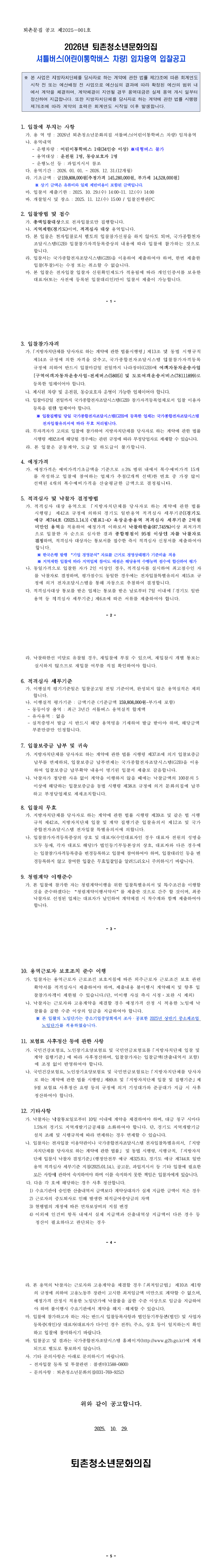 2026년 퇴촌청소년문화의집 셔틀버스(어린이통합버스 차량) 임차용역 |