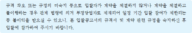 ※미자격자가 고의로 입찰에 참가하거나, 「지방계약법 시행령」 제92조의 각 항의 어느 하나에 해당한다고 판단될 경우에는 관계규정에 따라 부정당업자로 제재할 수 있습니다.
