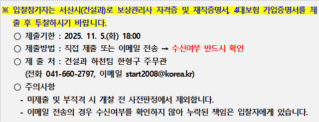 ○ 입찰에 관한 문의사항 : 서산시 회계과 박영진(☏ 041-660-2272)