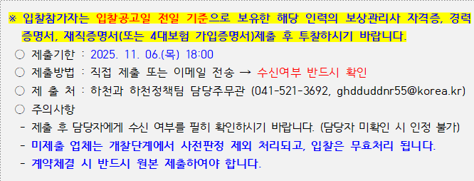 나. 본 입찰에 참가하고자하는 자는 중대재해 예방을 위한 안전 및 보건 확보 의무사항을 숙지하신 후 입찰에 응하여야 하며, 계약 체결 시에 「안전보건관리 준수 서약서」를 제출하여야 합니다.