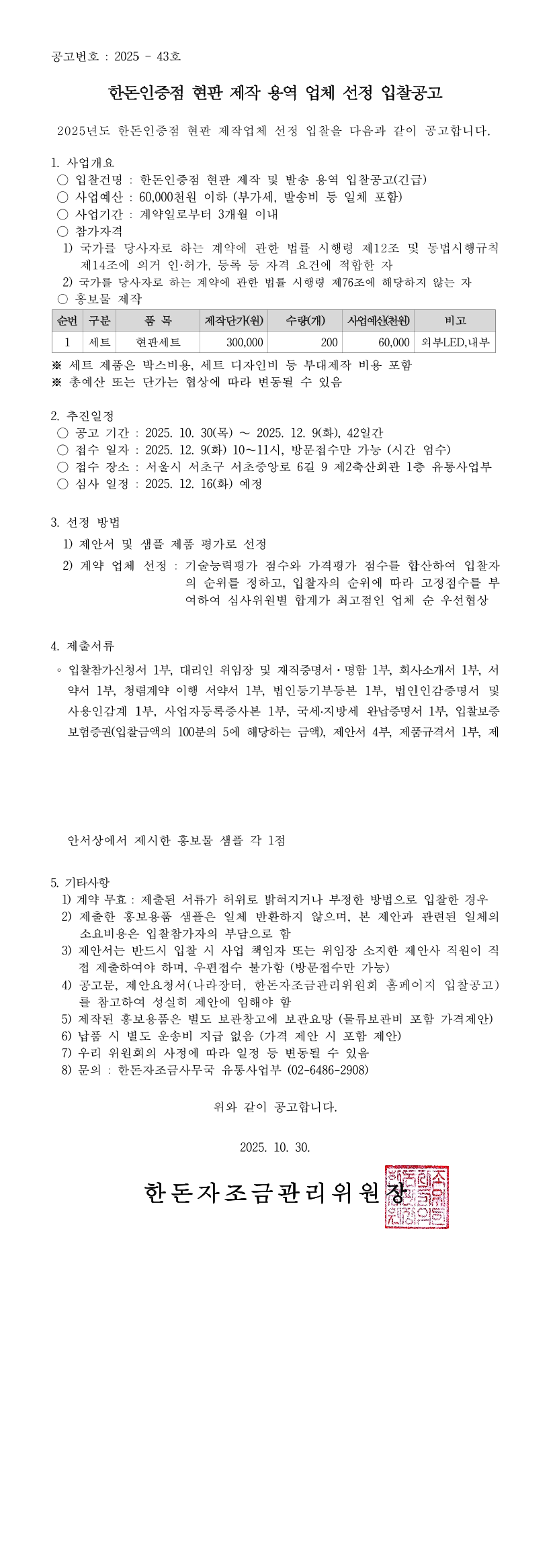 한돈인증점 현판 제작 용역 업체 선정 입찰공고 |