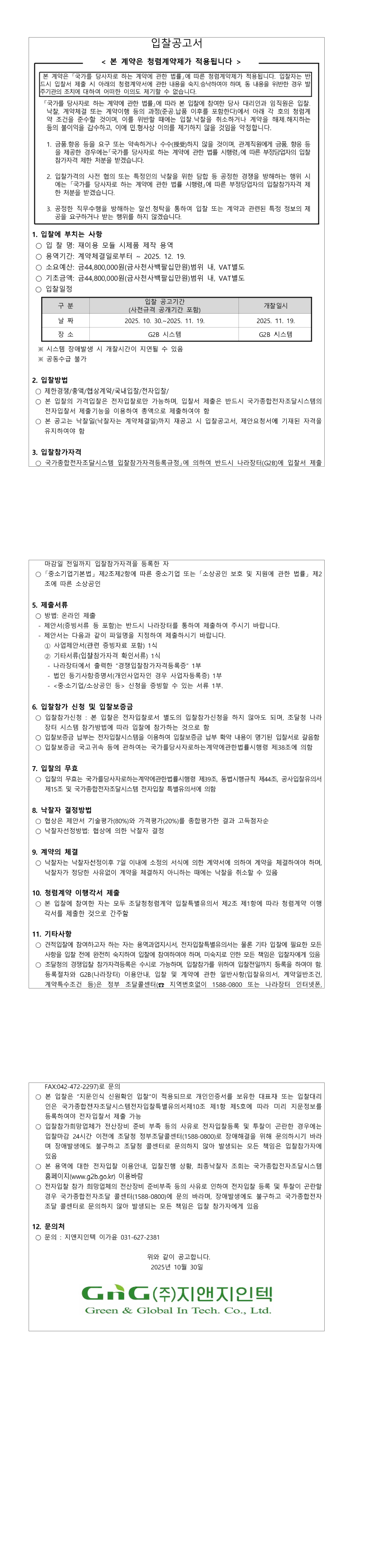 | 공고기관 | (주)지앤지인텍 | 수요기관 | (주)지앤지인텍 |